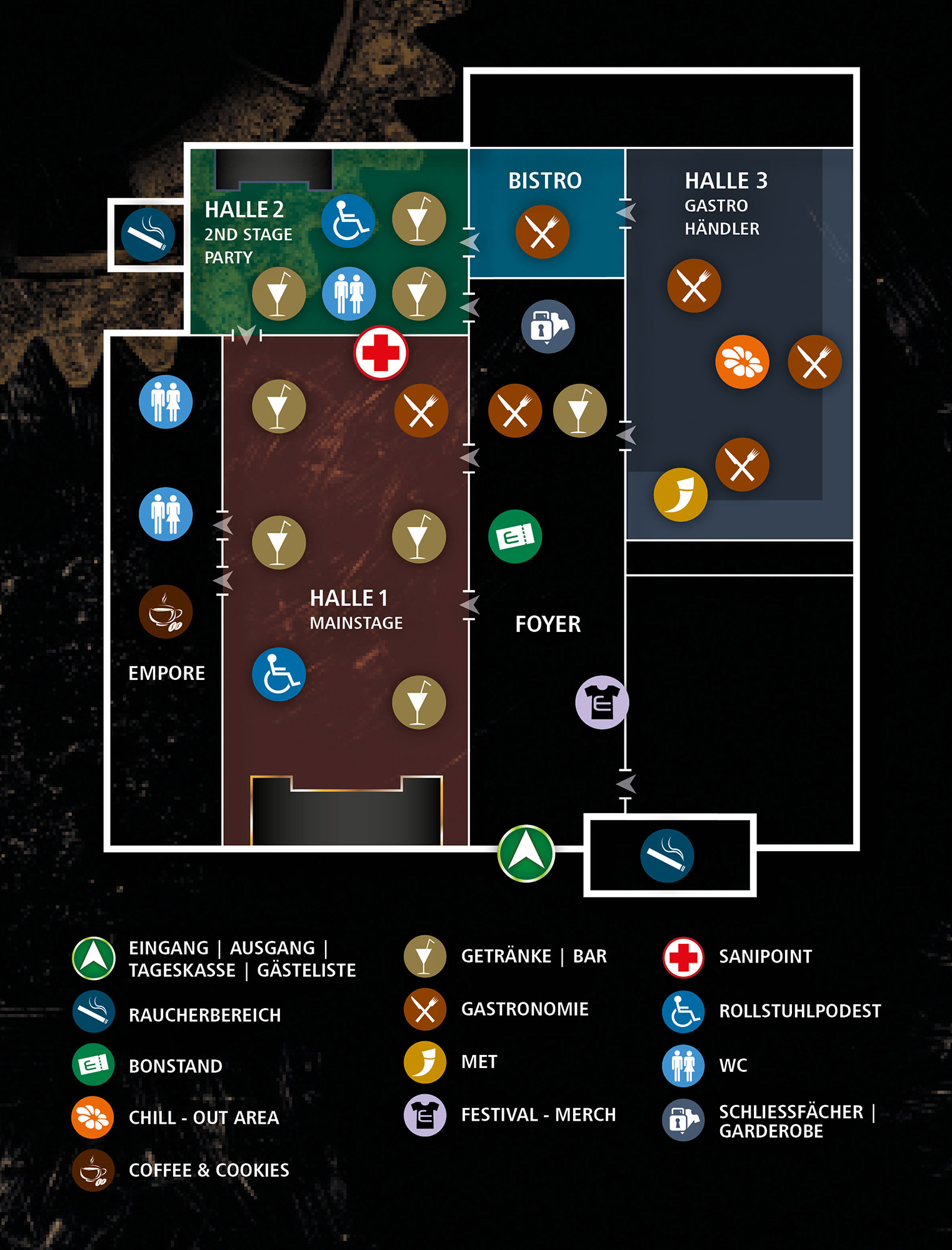 Built in 1909, the complex was used until the 1980s to generate electricity and compressed air for the Westphalian steel industry and was finally completely converted in the 1990s for cultural events with two live stages, a disco area, an indoor shopping mall, and much more. Ample parking directly in front of the building also contributes to a relaxed festival experience!